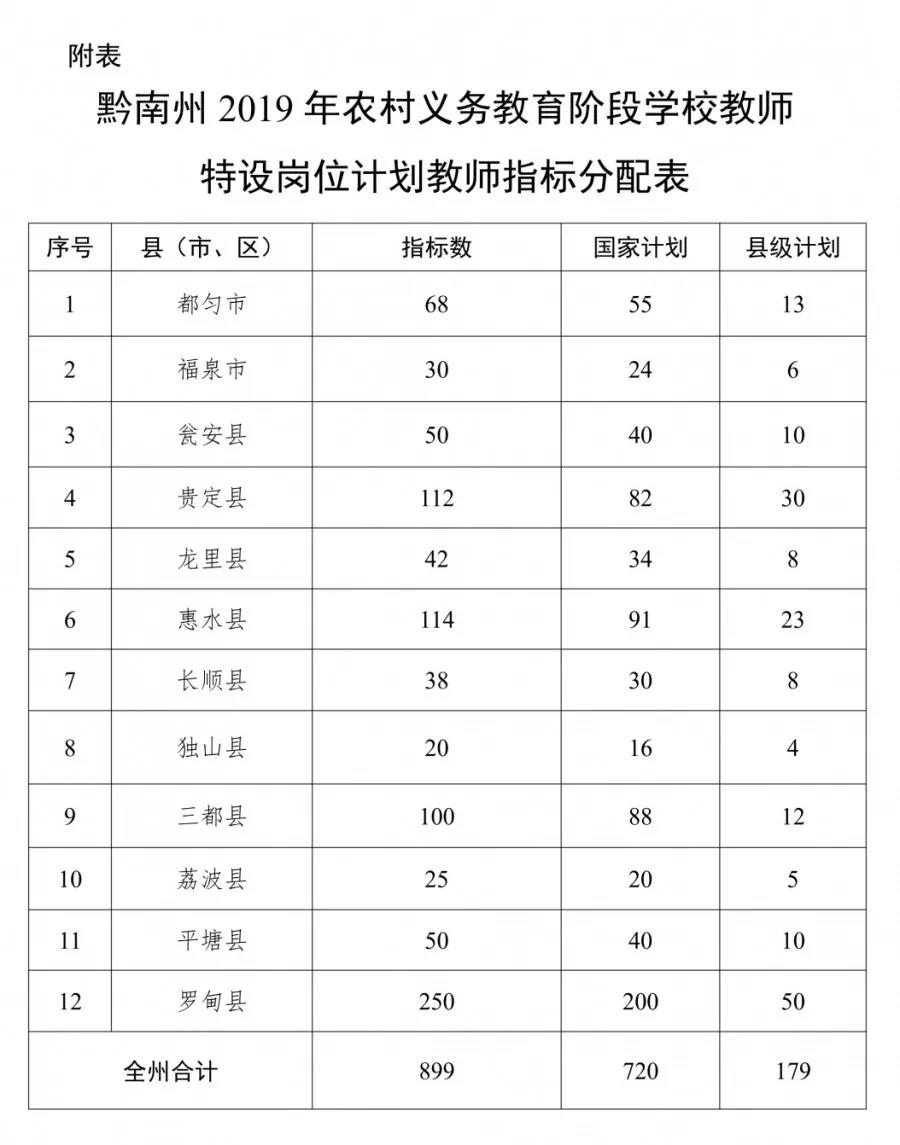 (二)2019年,全州安排“特崗計(jì)劃”指標(biāo)899名。其中國(guó)家“特崗計(jì)劃”720名,縣“特崗計(jì)劃”179名(具體指標(biāo)分配詳見附表)。