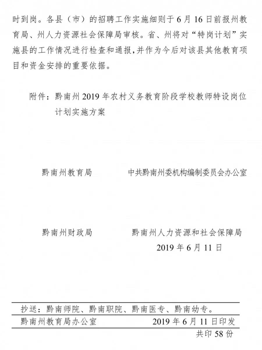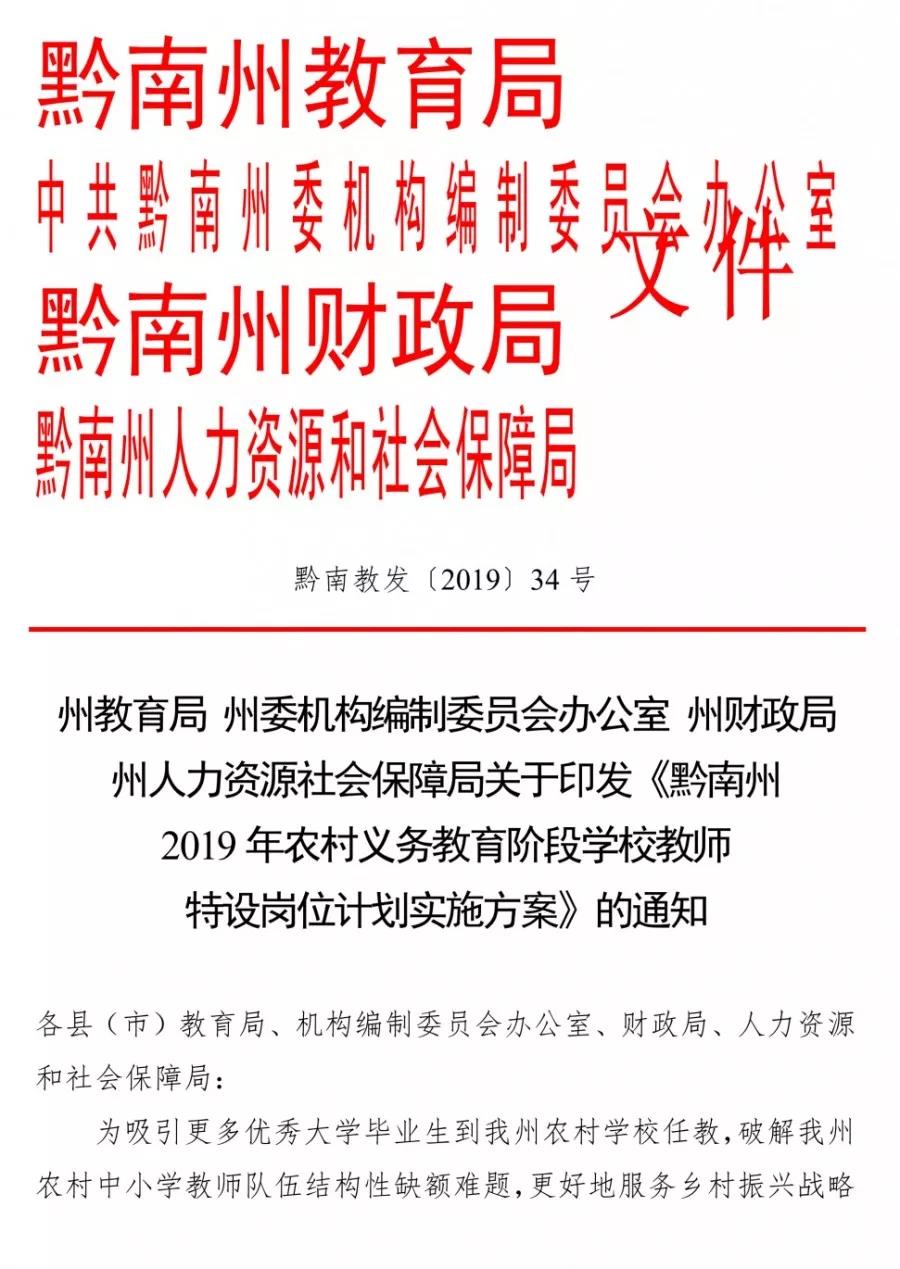 為進(jìn)一步加強(qiáng)我州農(nóng)村教師隊(duì)伍建設(shè),充實(shí)農(nóng)村學(xué)校師資力量,提升農(nóng)村教育質(zhì)量,根據(jù)《省教育廳省委機(jī)構(gòu)編制委員會(huì)辦公室省財(cái)政廳省人力資源和社會(huì)保障廳關(guān)于印發(fā)<貴州省2019年農(nóng)村義務(wù)教育階段學(xué)校教師特設(shè)崗位計(jì)劃實(shí)施方案>的通知》(黔教師發(fā)〔2019〕74號(hào))精神,結(jié)合我州實(shí)際,制定本方案。
