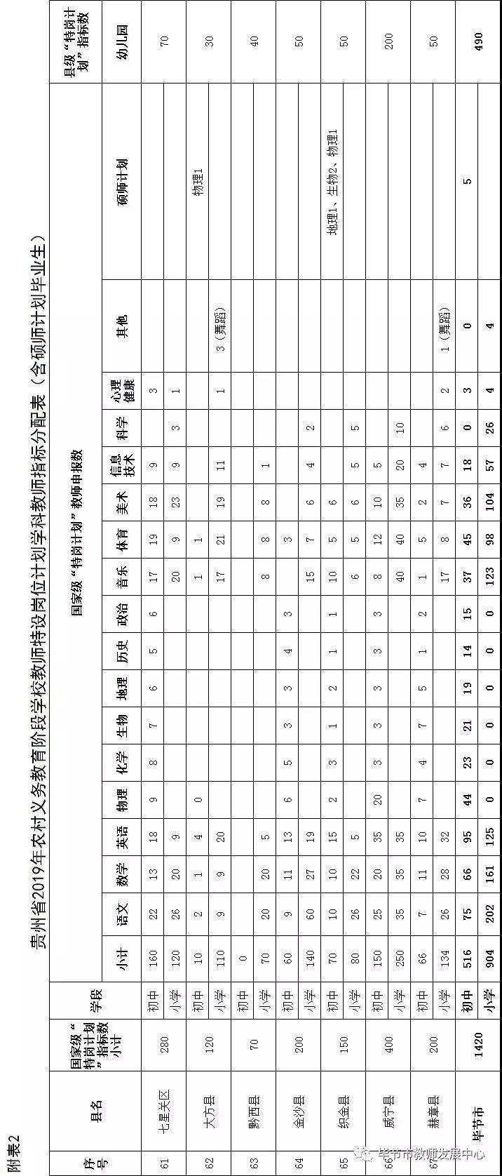 2019年全省安排“特崗計(jì)劃”指標(biāo)1910名在七星關(guān)區(qū)等7個(gè)縣(市、區(qū),下同),其中國(guó)家“特崗計(jì)劃”招聘1420名(含5名“碩師計(jì)劃”畢業(yè)生,具體名單見(jiàn)附表1,下同);縣級(jí)“特崗計(jì)劃”招聘490名,具體指標(biāo)分配詳見(jiàn)附表2。