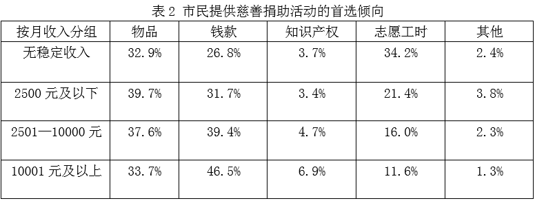 C. 愿意參加慈善捐助的人中,月均收入超過1萬元的人選擇錢物捐助的比例比有穩(wěn)定收入但月均收入2500元及以下的人高10個(gè)百分點(diǎn)以上