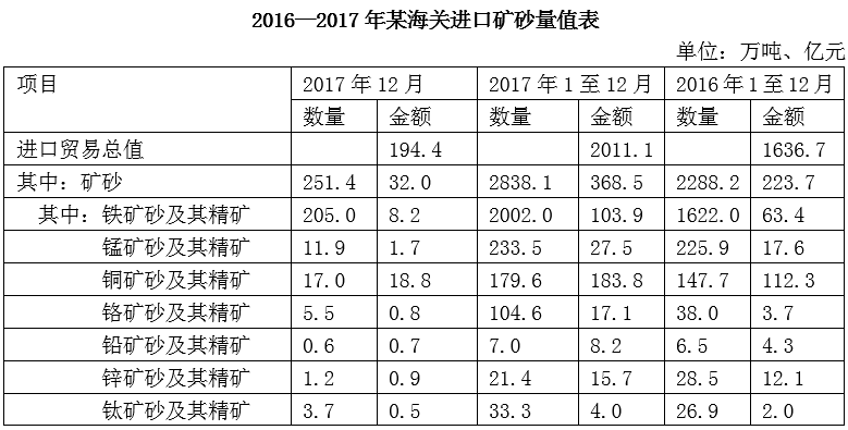 99. 2017年全年,該海關(guān)總計(jì)進(jìn)口鐵、錳、鉻、鉛、鋅、鈦之外的礦砂及其精礦約多少億元?